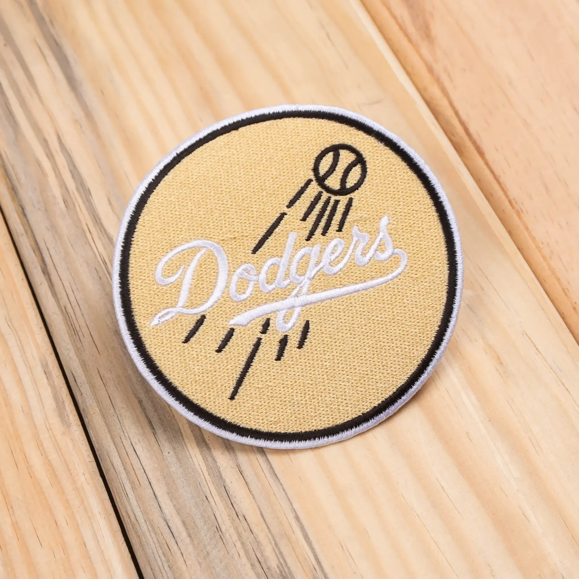 Showcase your Blue Heaven pride with this meticulously crafted Los Angeles Dodgers Vintage Logo Patch. This circular emblem features the timeless Dodgers script in crisp white, set against a warm, vintage-inspired cream twill background. The dynamic design captures a baseball in motion, accented with bold black stitching that provides a sharp, high-contrast finish.