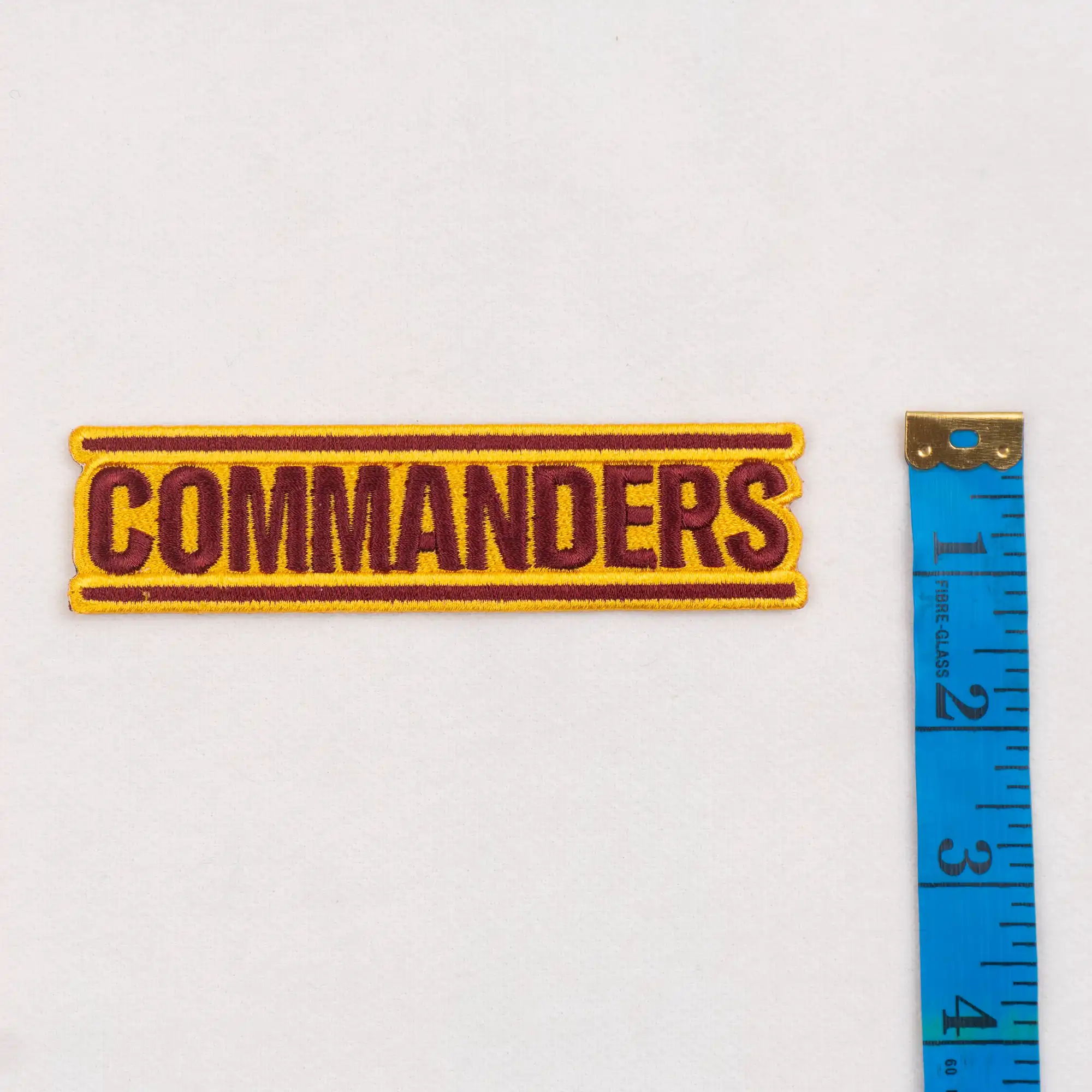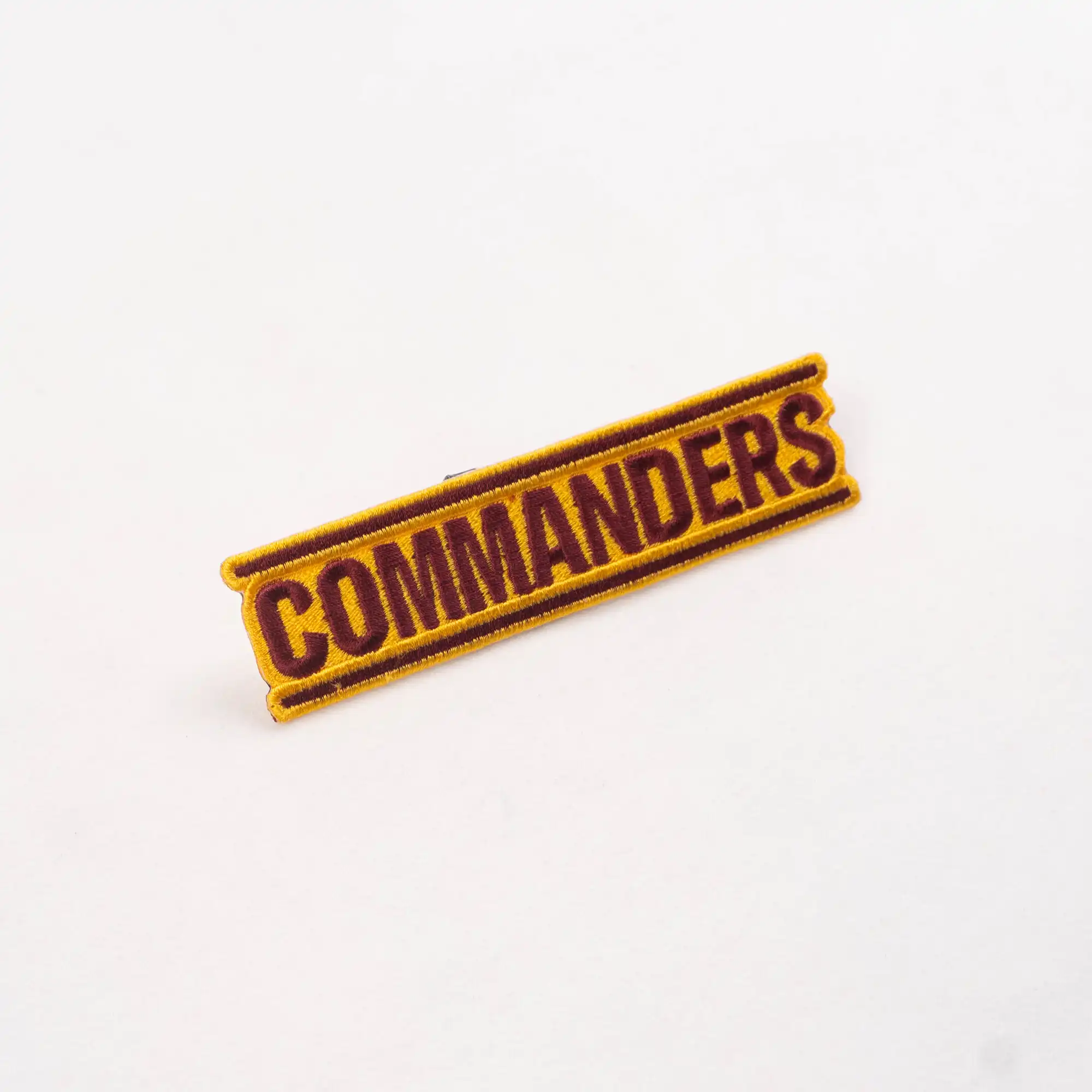 Elevate your game-day attire with this vibrant Washington Commanders Wordmark Patch. This rectangular embroidered applique features the bold “Commanders” block lettering in classic burgundy, set against a striking gold background with detailed border piping. Its sleek, horizontal design makes it incredibly versatile for placement on chest pockets, sleeve caps, or the back of adjustable caps.