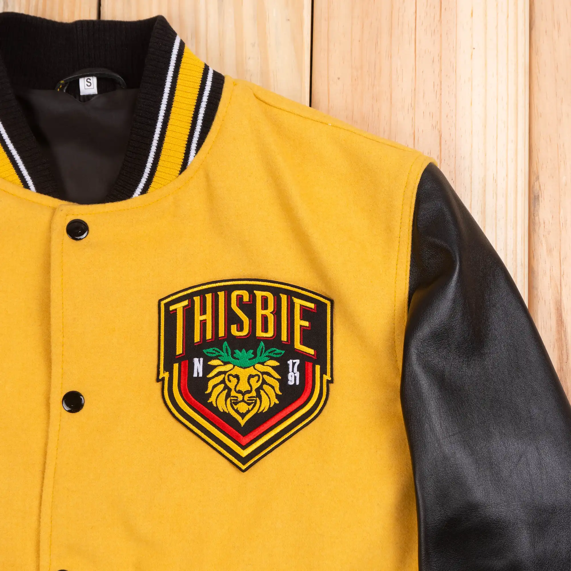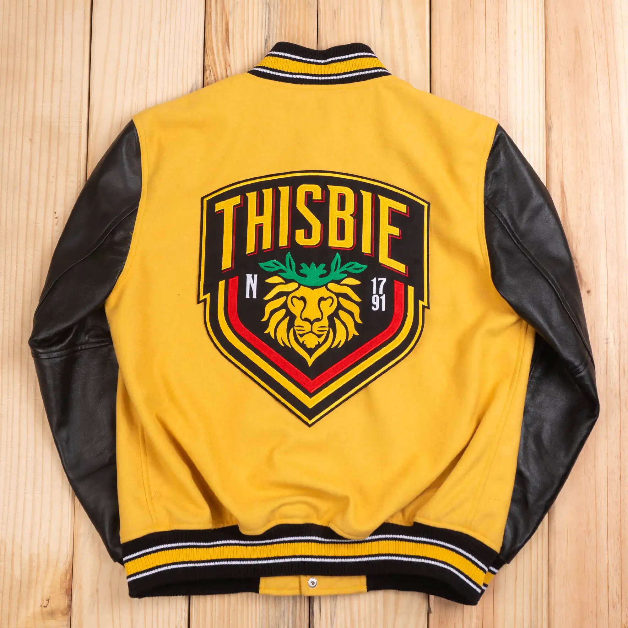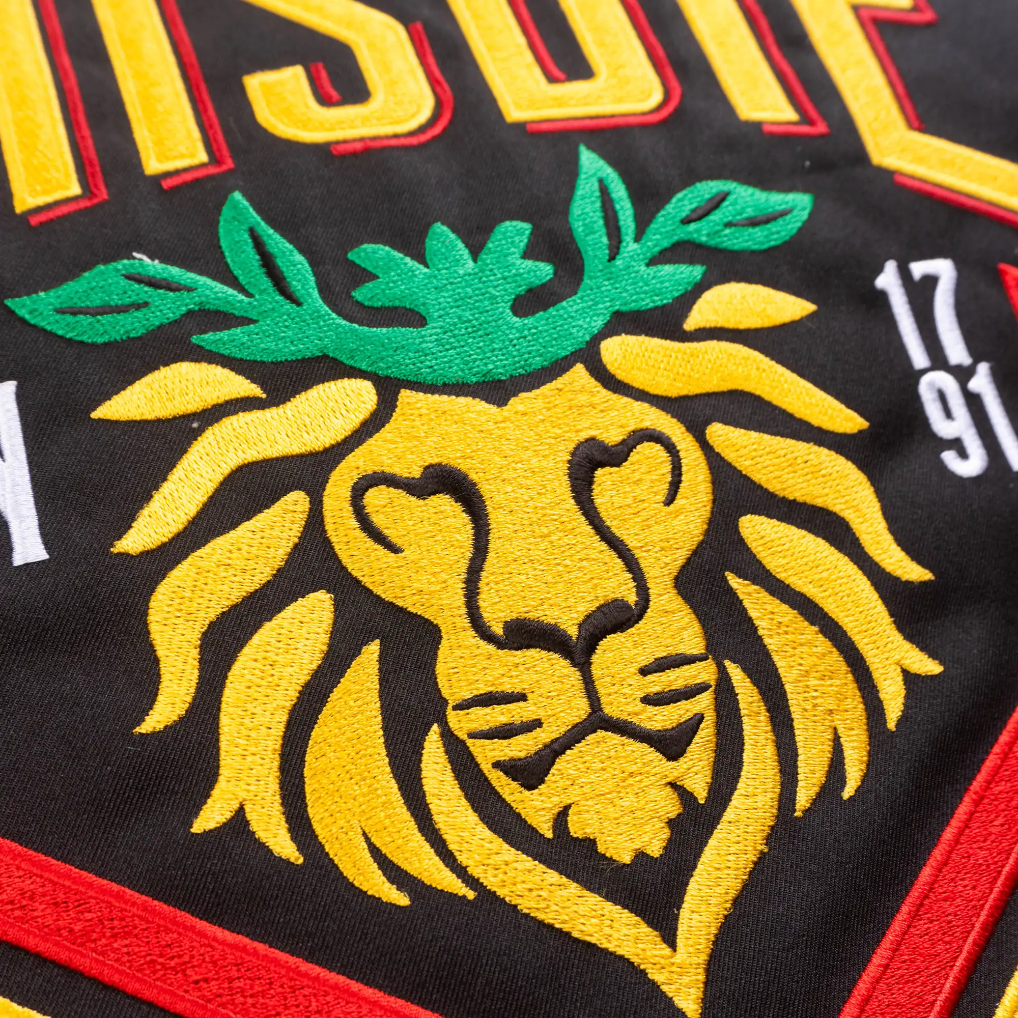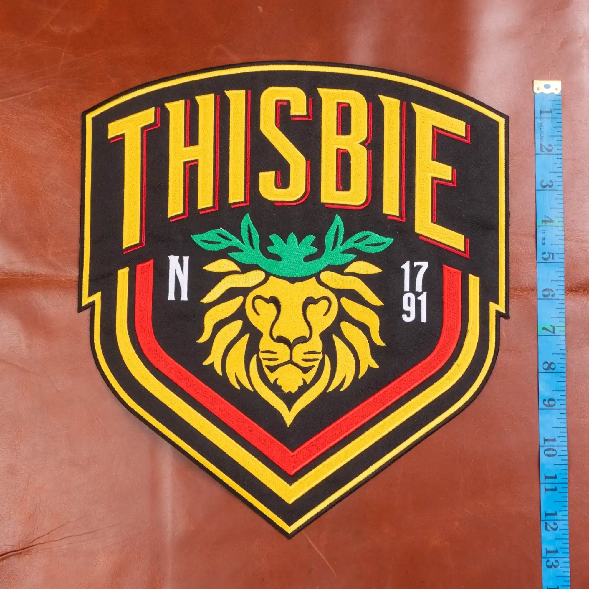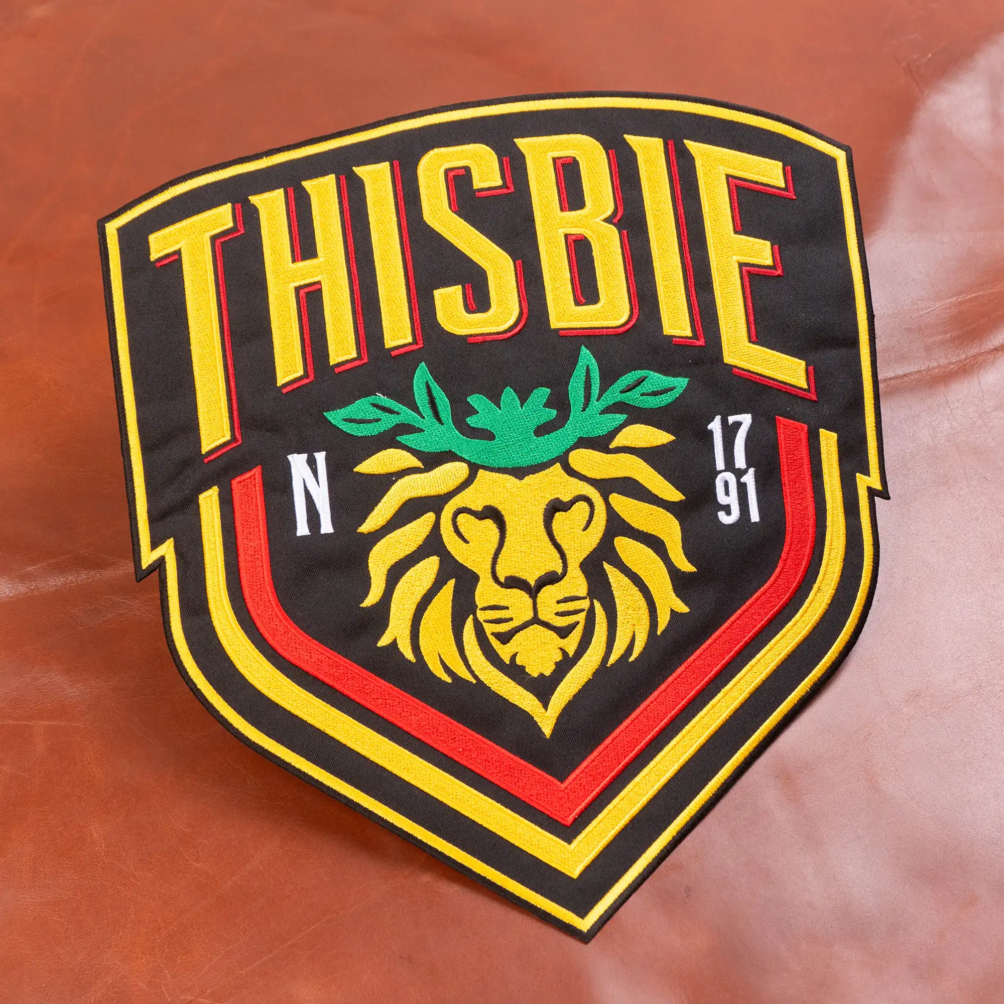 The design is a masterpiece of heraldic detail, featuring the striking “Gold and Red” house colors and a central, majestic Lion of Thisbie wearing a green laurel crown. Every element is captured in high-definition embroidery, from the “N” for Nevermore to the academy’s historical 1791 founding date.